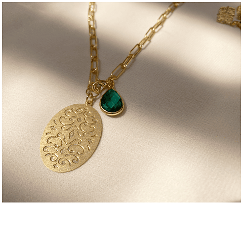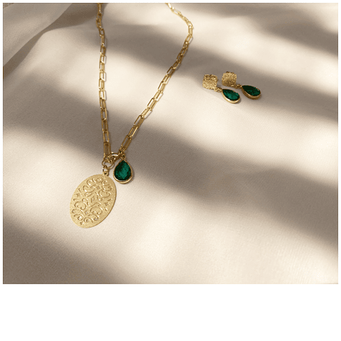 Espectacular conjunto chapado en oro de 24k con cristales facetados verde esmeralda.